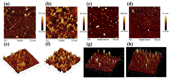 AFM images of hematite and magnetite particles: (a,e) rod-milled hematite particles; (b,f) ball-milled hematite particles; (c,g) ball-milled magnesite particles; (d,h) stainless steel disk-milled magnesite particles; (a–d) two-dimensional images; and (e–h) three-dimensional images [3,37,39].