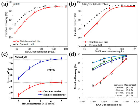Effect of surface roughness on flotation recovery of different minerals: ((a) stainless steel disk-milled (Ra = 0.28 nm) and ceramic ball-milled (Ra = 1.59 nm) magnesite [3]; (b) stainless steel disk-milled (Ra = 0.52 nm) and ceramic ball-milled (Ra = 1.16 nm) quartz [41]; (c) smooth (stainless steel) and rough (ceramic ball) cassiterite [68]; and (d) sphalerite particles [31]).