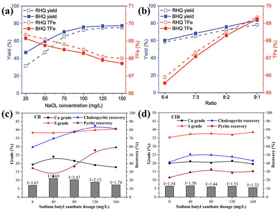 Flotation separation of hematite from quartz ground under different (a) NaOL concentrations and (b) ratio of hematite to quartz (RHQ: rod-milled hematite (Ra = 2.1 nm) particles mixed with quartz; BHQ: ball-milled hematite (Ra = 8.5 nm) particles mixed with quartz [39] and flotation separation of chalcopyrite from pyrite ground by (c) ceramic ball (Rq = 9.02 nm) and (d) cast iron ball (Rq = 74.80 nm) under different sodium butyl xanthate concentrations [73].