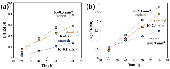 Flotation kinetics of smooth (Ra = 1–8 nm), abraded (Ra = 6–18 nm), and etched (Ra = 28–170 nm) glass particles methylated in (a) 10−5 M (θ = ~39°) and (b) 10−5 M (θ = ~73°) trimethylchlorosilane solutions [57].