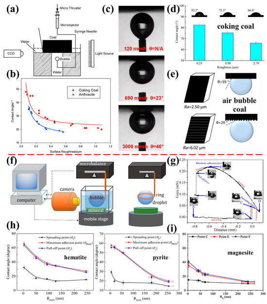 Effect of different surface roughness of natural minerals on contact angle. (a) bubble contacting test device; (b) coking and anthracite coal particles; (c) bubble contacting with coking coal surfaces [116]; (d) coking coal particles [117]; (e) coal particles [118]; (f,g) schematic of contact angle measurement device for air bubbles and water droplets [120]; (h) contact angles of air bubbles measured on hematite and pyrite surfaces (receding, stable, and advancing contact angle measured at point C (spreading), point E (maximum adhesion), and point F (pull-off)) [58]; and (i) contact angle of water droplets measured on magnesite surfaces [120].