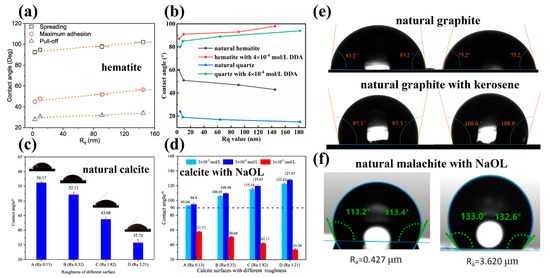 Effect of different surface roughness of natural minerals on contact angle with addition of collectors. (a) The water droplet on hematite surfaces after interacting with 125 mg/L NaOL at pH 9 [39]; (b) natural hematite and quartz in absence and presence of 4 × 10−4 mol/L dodecyl amine (DDA) [59]; (c,d) natural calcite in absence and presence of NaOL [1]; (e) natural graphite in absence and presence of kerosene [38]; and (f) malachite surface after treatment with 5 × 10−5 mol/L sodium oleate at pH 9 [2].