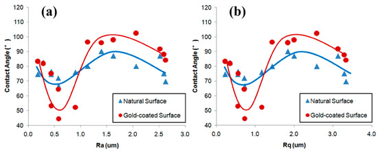 Numerous studies have confirmed that an increased surface roughness enhances the hydrophobicity of hydrophobic surfaces and the hydrophilicity of hydrophilic surfaces. However, some researchers have reported differing results. For example, Xia [83] observed that for natural hydrophilic surfaces, increasing the surface roughness of ultra-low-ash coal particles from 0.2 μm to 1.6 μm increased the contact angle from about 77° to 83°. They also found that the contact angles for anthracite particles were 88°, 87°, 86°, and 80° when the surface roughness was 2.68 μm, 2.49 μm, 1.66 μm, and 1.12 μm, respectively [91]. They further reported that variations in surface roughness did not directly influence wettability. The wettability of natural and gold-coated ultra-low-ash coal surfaces initially increased with the surface roughness, then decreased, and finally experienced a slight increase again (Figure 8a,b) [60]. Wang et al. [122] demonstrated that as the surface roughness increased, both the advancing and receding contact angles continued to rise until reaching their maximum values, after which they began to decrease within the studied range of the surface roughness. In studies involving natural hydrophilic (θ < 90°) particle surfaces treated with collectors, Ulusoy and Yekeler et al. [33,34,48,49,62,63] reported that smoother surfaces improved the hydrophobicity of minerals such as quartz, calcite, barite, talc, and chalcopyrite with the addition of collectors. Zhang et al. [98] found that the contact angle of chalcopyrite increased from 79.8° to 100.9° and attributed this change to the presence of smoother surfaces.