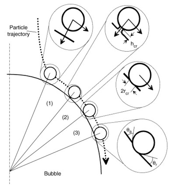 A successful particle–bubble attachment involves three key microprocess: the rupture of the liquid film, the formation of a three-phase wetting peripheral, and the formation of a stable wetting perimeter (Figure 10) [21,142,143]. The particle slides around the bubble’s surface when it meets the bubble in the slurry. The liquid film between the bubbles and the particles subsequently thins to the critical thickness and breaks to form the three-phase contact (TPC) line. This contact line continues to expand until a stable wetting perimeter is formed [141,144]. It is essential for all these sub-processes to occur in a brief contact time between a bubble and a solid surface, particularly under quite turbulent conditions [145]. The bubble–particle attachment time () can be calculated by summing the times required to complete each of the three attachment processes, as described by the following relationship (Equation (10)) [146,147]: