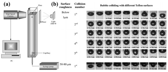 (a) Experimental setup for monitoring bubble collision process [127]; (b) snapshots of bubble collisions and three-phase contact spreading on Teflon plates with different roughness [155].