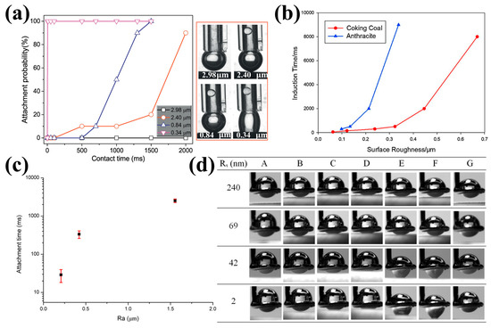 (a) Induction time of coal samples with different Ra value under natural conditions (insets are snapshots of TPC line after bubble retracted to original position) [61]; (b) induction time test of coking coal and anthracite [116]; (c) attachment times between bubbles and coal surfaces with various roughness [83]; and (d) images of air bubbles in water during interactions with magnesite surfaces of different roughness [120].