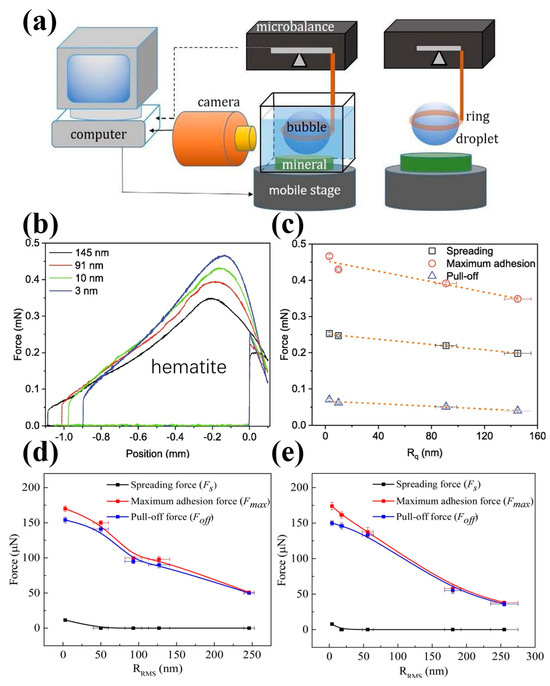 - Zhu, C.; Li, G.; Xing, Y.; Gui, X. Adhesion forces for water/oil droplet and bubble on coking coal surfaces with different roughness. Int. J. Min. Sci. Technol. 2021, 31, 681–687. [Google Scholar] [CrossRef]