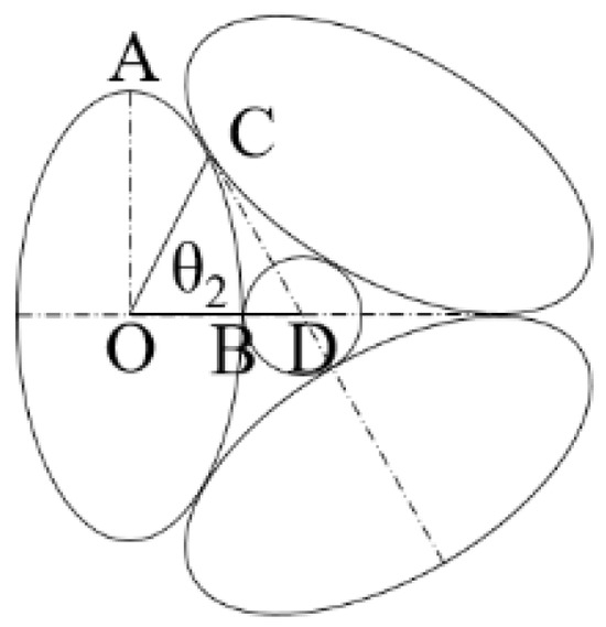Under ideal conditions, the particles in the filter layer that form the theoretical maximize the effective pore radius are arranged as depicted in Figure 3. The analysis was conducted using the upper-left portion of the axisymmetric diagram. The long-axis radius, OA, is denoted as a, and the short-axis radius, OB, is denoted as b. The contact point between the two ellipsoidal particles is denoted as C, with OC = c. The effective pore radius of the filter for this particle arrangement is BD = rmax.