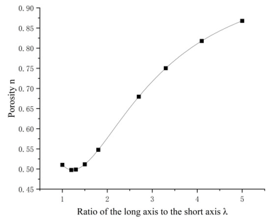 Assuming that the ratio of the long axis to the short axis is a/b = λ, the porosity n of the soil in a loose arrangement for different values of λ is calculated. The results of these calculations are presented in Table 1. As shown in Table 1, the porosity of the soil in a loose arrangement is minimized at a λ value of 1.2, with a porosity of 0.498. For λ < 1.5, the porosity of ellipsoidal particles is less than that of spherical particles. When λ > 1.5, the porosity of ellipsoidal particles exceeds that of spherical particles. Additionally, the porosity increases with λ, with the growth rate initially rising and then decreasing, as shown in Figure 7.