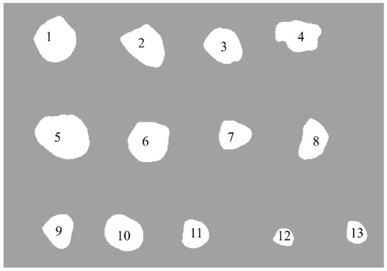 Figure 11 shows the black and white binary image obtained by processing Figure 10, This image clearly displays the projection shape of each particle, with the lighter areas representing the particles. ImageJ software can automatically detect the boundaries of each individual particle and assign the particles unique labels, facilitating the subsequent extraction of their shape parameters.