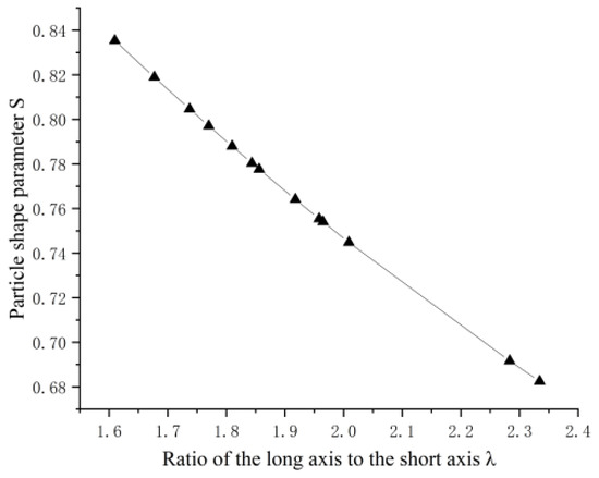 The scanned particles had a size range of 2–5 mm, and the shape parameters in Table 4 correspond to this particle-size range. (The average values presented in Table 4 represent the means of the parameters for all 13 particles.) Figure 12 shows that the ratio of the long axis to the short axis λ for each particle is approximately linearly related to the corresponding particle-shape parameter S, which is consistent with the conclusion drawn in Section 3.3.