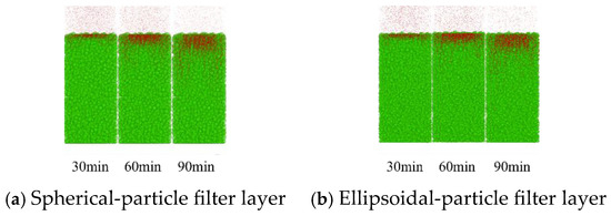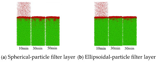 Figure 14 shows the muddy-water seepage of 0.25–0.5 mm tailings-sand particles through the spherical-particle filter layer and the ellipsoidal-particle filter layer, respectively. Unlike 0.5–1 mm tailings-sand particles, 0.25–0.5 mm particles almost all entered the filter layer during seepage, with most particles remaining at a depth of 10–20 cm within the filter layer and a small number of particles penetrating the filter layer (the particles located below the filter layer indicate those that have seeped through the filter layer). The intrusion depth of tailings-sand muddy-water particles was significantly greater in the spherical-particle filter layer than in the ellipsoidal-particle filter layer, and the number of seepage particles that penetrated the filter layer was also considerably higher than that in the ellipsoidal-particle filter layer.