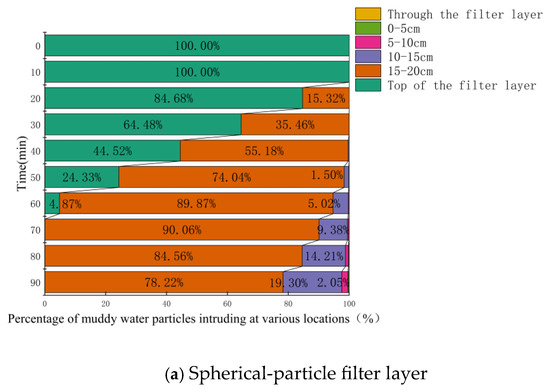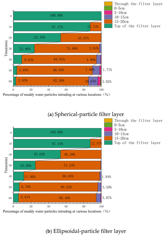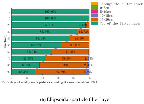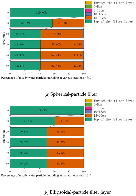 Figure 16, Figure 17 and Figure 18 present the statistical results for tailings-sand particles of various sizes (specific proportions are omitted in the figure when they are less than 1%). It can be observed that as the particle size of tailings sand decreased, the proportion of particles infiltrating the filter layer and the depth of infiltration both increased. With the exception of 0.075–0.25 mm tailings-sand particles, for other particle sizes, the proportion of infiltrating particles and the depth of infiltration for the spherical-particle filter layer were greater than those for the ellipsoidal-particle filter layer.