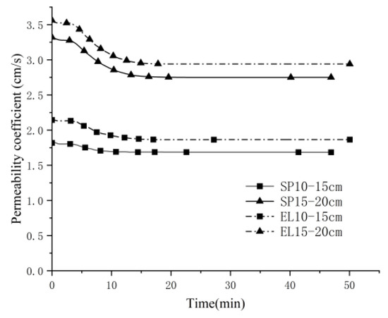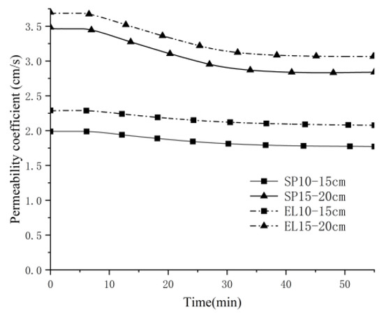 The calculated permeability coefficients for filters with varying particle shapes are presented in Figure 19, Figure 20 and Figure 21. In the figures, SP represents a spherical-particle filter layer, whereas EL denotes an ellipsoidal-particle filter layer. Analysis of Figure 19, Figure 20 and Figure 21 indicates that, based on the results derived from Darcy’s formula, the permeability coefficient of the spherical particle model is lower than that of the ellipsoidal particle model.