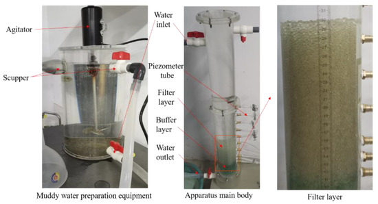 (3) The test began: At the start of the muddy-water percolation test, the anti-filtration layer was saturated before the first vacuum, and this step was followed by 30 min of clear-water percolation. During this period, the stability of the head of the pressure-measuring tube was observed and the flow rate was recorded every 5 min. Once a stable seepage field was formed in the anti-filtration layer, tailings-sand particles were added to the water tank to start the muddy-water percolation test. Throughout the muddy-water percolation test, continuous stirring of the tailings water in the tank was required to maintain a constant concentration of the test water.