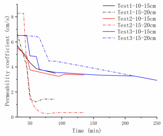 Figure 16, Figure 17 and Figure 18 illustrate various forms and the evolution of clogging in the filter layer during muddy-water seepage. For the uniform filter layer ranging from 2 to 5 mm, 0.5–1 mm tailings-sand particles were concentrated above the filter layer and at a depth of 15–20 cm within the first layer of the filter layer, indicating surface-internal deposition. Most of the 0.25–0.5 mm tailings-sand particles were retained at a depth of 15–20 cm within the first layer of the filter layer, while a small amount continued to migrate to 10–15 cm within the second layer, indicating internal clogging. For the 0.075–0.25 mm tailings particles, although Figure 18 suggests that the clogging morphology was similar to that of the 0.25–0.5 mm tailings particles, this similarity arises from the significant size difference between the 0.075–0.25 mm particles and the filter layer. The finite element software processes data very slowly, making it challenging to reach an equilibrium state, and observations and calculations indicate that the infiltration of tailings particles of this size exerts minimal influence on the filter layer’s permeability coefficient, which is why only a portion of the calculation results are presented. In fact, because the tailings-sand particles were significantly smaller than the pore diameter of the filter layer, the filter layer cannot provide effective filtration of the tailings-sand particles; the result is the eventual passage of tailings-sand particles through the filter layer, a form of seepage failure.