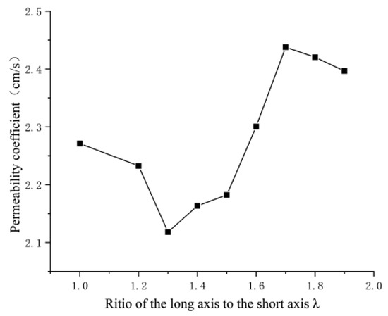 Figure 24 shows the permeability coefficient of the model (without the inclusion of tailings-sand particles) under different particle-shape parameters, calculated using Darcy’s formula. With the increase in the ratio of the long axis to the short axis, λ, the permeability coefficient of the model initially decreases and then increases. When the λ value is between 1.3 and 1.4, the permeability coefficient of the model is minimized; at λ values of 1.7 to 1.8, the permeability coefficient reaches its maximum, and subsequently, the rate of change in permeability coefficient diminishes. The value of λ = 1.6 can be regarded as a boundary for the permeability coefficient of the model. Prior to this point, the permeability coefficient of each particle shape model is lower than that of spherical particles; beyond this threshold, it becomes greater.