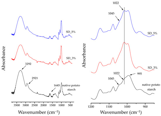 FTIR spectra of native potato starch and spray-dried potato starch powders at concentrations of 3% [SD_3%] and 5% [SD_5%] in 3800–300 cm−1 region and in 1200–850 cm−1 region.