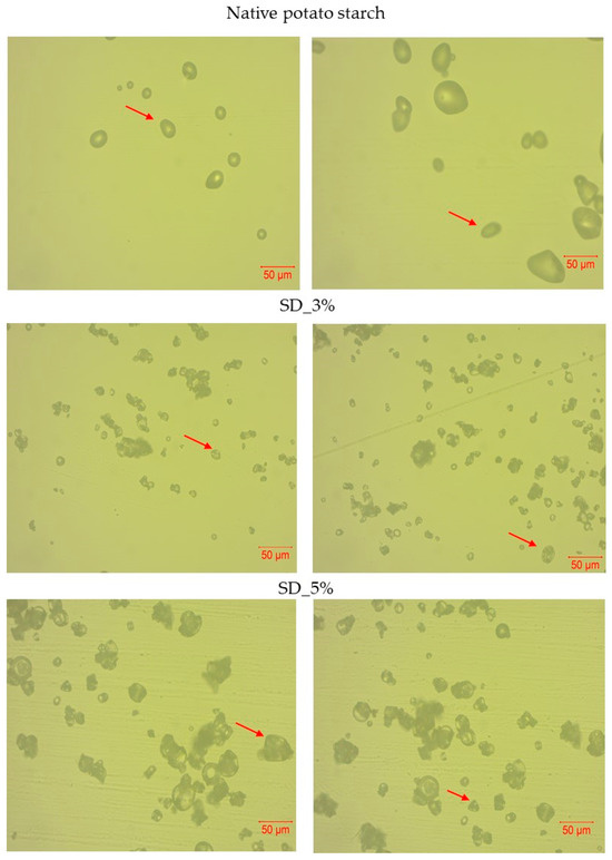 Optical images of native potato starch and spray-dried potato starch powders at concentrations of 3% [SD_3%] and 5% [SD_5%]. Red arrows indicate the spherical granules in the native potato starch and the wrinkled granules in spray-dried starch powders.