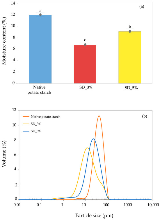 Moisture content is an important factor that affects the quality and stability of the powder [51]. According to Figure 4a, native potato starch exhibited the highest moisture content values. In detail, the moisture content of native starch was significantly higher than that of the spray-dried starch powders. That is, at an inlet temperature of 220 °C, the temperature gradient between the hot air and liquid feed is increased, which in turn would reduce the final moisture content [52]. The results showed that the spray-dried powders with 5% starch concentration had a higher moisture content compared to those with 3% starch concentration. This is likely assigned to the increased viscosity of the starch solution, which affects droplet formation and the moisture evaporation during drying. Probably, the increased viscosity of the SD_5% starch solution caused the formation of larger droplets with a lower surface area, reducing moisture evaporation and resulting in greater retention in the final products. On the contrary, in the case of the SD_3% powder, smaller droplets were formed with a higher surface area, favoring the evaporation of water. During atomization, feed solutions with high viscosity generally result in the formation of larger particles, as postulated by Koc et al. [53]. However, it should be noted that the hydrophilic nature of starches prevents the evaporation of water during drying. Thus, it can be implied that the moisture content of the spray-dried powders could be affected by their particle size and hydrophilic nature.