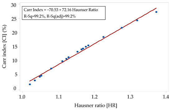 A fitted line plot of the Carr index versus the Hausner ratio is depicted in Figure 5. Based on the regression equation, for every 1-unit increase in the Hausner ratio, the Carr index increases by 72.16 units. This suggests a positive linear relationship between the Carr index and Hausner ratio, indicating that the powders are more cohesive with less flowability.