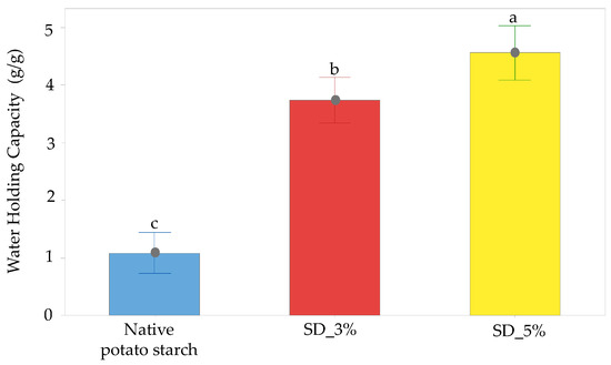 Figure 6 shows the water holding capacity (WHC) of native potato starch and spray-dried starch powders [SD_3%, SD_5%]. Significant differences were found in the WHC of native potato starch and spray-dried starch powders. In detail, the SD_5% exhibited the highest WHC values, followed by the SD_3% powder, while native potato starch showed the lowest values. The WHC values of SD_3% powder were lower than those of SD_5% powders, indicating that there are fewer available sites for water retention. On the contrary, native potato starch exhibited the lowest WHC values, which could be attributed to the semi-crystalline structure of starch. Fadimu et al. [21] reported that by increasing crystalline regions and decreasing amorphous regions, the water absorption capacity of modified sweet potato starch decreased due to limited water binding sites. Sheng et al. [65] reported that the water binding capacity of starch increased due to the disruption of secondary bonding, e.g., hydrogen bonds in the starch molecular chains during gelatinization.