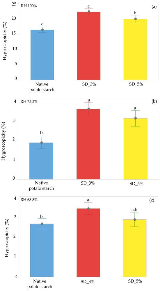 Hygroscopicity values of native potato starch and spray-dried potato starch powders at concentrations of 3% [SD_3%] and 5% [SD_5%] stored at relative humidity of 100% (a), 75.3% (b), and 68.8% (c). The vertical lines denote the 95% confidence intervals for the means, calculated using the error mean square from the analysis of variance. Groups that do not have a common letter are significantly different, as assessed by Tukey’s pairwise comparison of means (p < 0.05).