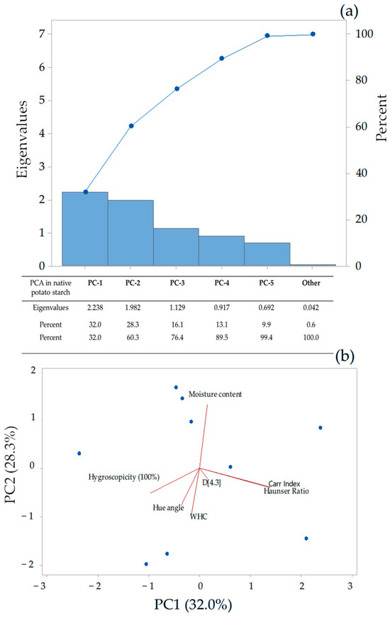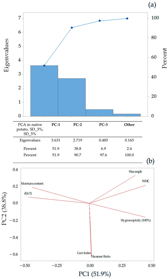 PCA was further used to analyze all data for both native and spray-dried potato starches (3% and 5%). The Pareto chart of the PCA results in Figure 11a shows the explained and accumulated variance for each principal component. According to the results presented in Figure 11a, the first two principal components (PC-1 and PC-2) have eigenvalues greater than 1. The first two principal components explain 90.7% of the variation in the experimental data, where component 1 and component 2 account for 51.9% and 38.8% of the variance, respectively. In the loading plot (Figure 11b, and Table 9), the variables that positively correlated strongly with principal component 1 were hygroscopicity (100%) and WHC (coefficients of 0.478 and 0.409, respectively), while the variables that strongly negatively correlated were D(4.3) and moisture content (coefficients of −0.517 and −0.483, respectively). PC-2 has a positive correlation (0.446) with hue angle and negative correlations with Hausner ratio and Carr index (coefficients of −0.565 and −0.569, respectively). The first three principal components explain 97.6% of the variation in the data. A negative relationship was observed between hygroscopicity, moisture content, and D(4.3), while a positive relationship was found between the Carr index and Hausner ratio, as well as between the hue angle and water holding capacity (WHC).