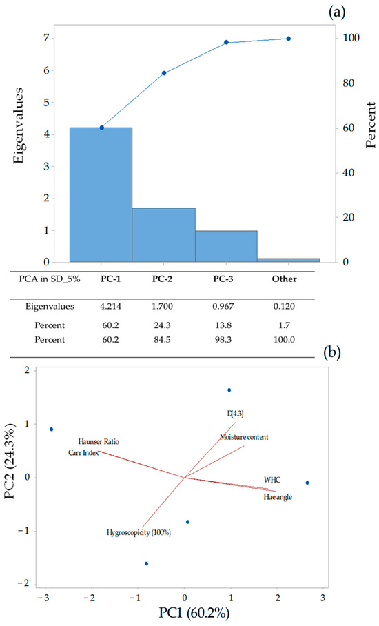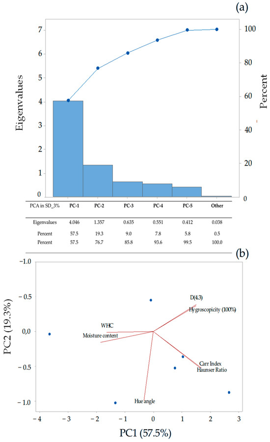The Pareto chart of the PCA results in Figure 9a shows the explained and accumulated variance for each principal component in the spray-dried potato starch at concentration of 3% [SD_3%]. According to the results presented in Figure 9a, the first two principal components (PC-1 and PC-2) have eigenvalues greater than 1. The first two components explain 76.7% of the variation in the experimental data, where component 1 and component 2 account for 57.5% and 19.3% of the variance, respectively. In the loading plot (Figure 9b and Table 7), the variables that have the highest positive correlation with the first principal component (PC-1) are the Carr index (0.418) and Hausner ratio (0.409). From Figure 9b, it can also be seen that the variables moisture content and WHC have negative correlation coefficients (−0.460 and −0.404, respectively) on the component PC-1. The second principal factor (PC-2) has a negative correlation (−0.730) with the hue angle. As shown in Figure 9, the hue angle is negatively related to hygroscopicity and D(4.3), while the Carr index and Hausner ratio are negative related to WHC and moisture content. The first three principal components explain 85.8% of the variation in the data.