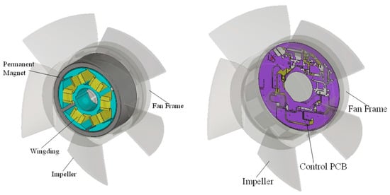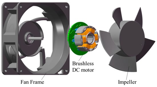 Axial flow fans are extensively employed in electronic devices for thermal management due to their compact structure, high efficiency, and reliable airflow generation. A typical axial flow fan comprises three key components: a brushless DC (BLDC) motor, an impeller, and a fan frame, as illustrated in Figure 1. The impeller is directly coupled to the motor shaft, and when energized, the motor drives the impeller to rotate, producing an axial airflow that enhances convective heat dissipation within electronic enclosures.