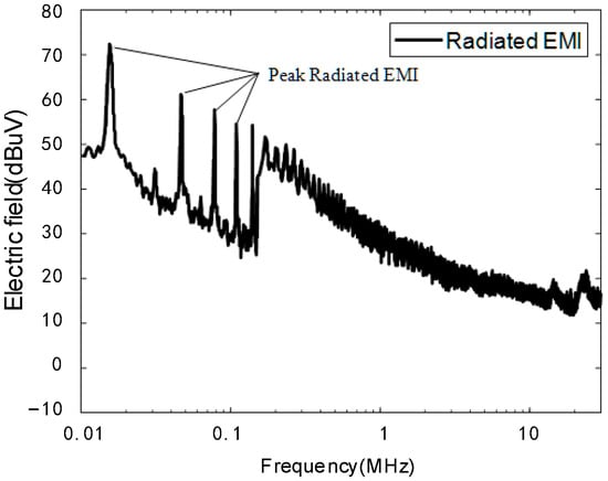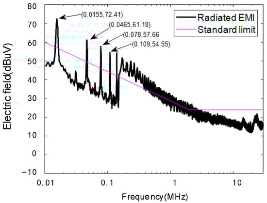 The fan under test had a rated voltage of 24 V, a rated power of 103.8 W, a peak speed of 10,500 rpm, and a pole pair number of 2. Under the PWM condition, the results of the electric field radiation measurement on the fan were as shown in Figure 7. At the frequency of 15.5 kHz, the intensity of the radiated electric field measured was 72.41 dBμV/m, which was higher than the limit value of 57.02 dBμV/m required by the standard. According to the measurement results, it can be seen that there were a number of peaks of interference exceeding the standard limits in the measurement band at a series of peaks with a fundamental frequency of 15.5 kHz, which is consistent with the modulation frequency of the PWM, indicating that these frequency peaks were indeed caused by the switching of the MOSFETs in the inverter circuit with their frequency harmonics.