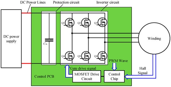 The axial flow fan is driven by a PWM permanent magnet brushless DC motor. The drive circuit mainly consists of a control chip, a MOSFET drive circuit, an inverter circuit, a protection circuit, and a winding coil, as shown in Figure 3.