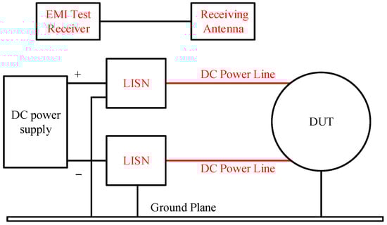 At present, research mainly focuses on the mechanism of conducted interference, focusing on the modeling and suppression of conducted interference in electrical machines. Conducted interference models for switch devices were established in [], and a numerical model of a power transfer system was developed and used in simulation []. The conducted interference of a motor drive system was analyzed and modeled in [,,]. The EMI suppression method of the DC motor was studied in [,] to attenuate both common-mode (CM) and differential-mode (DM) interference.