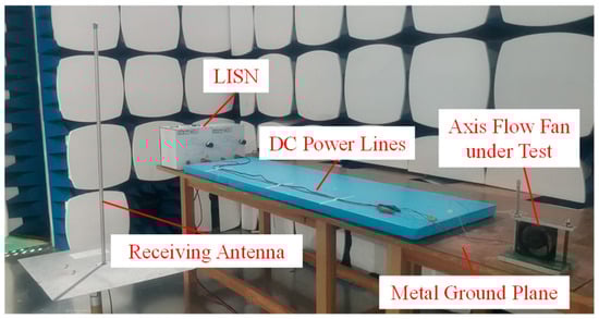 According to MIL-STD-461G, the radiated emission measurement configuration of the fan was as is shown in Figure 5. The measurement layout consisted of a DC power supply, two DC line impedance stabilization networks (LISN), two power lines, a receiver antenna, an EMI receiver, and the fan under test. The measurement environment was a shielded dark room, and the receiving antenna was placed 1 m away from the device under test, as shown in Figure 6. Within the rated operating range of the fan, the EMI receiver antenna measured the amplitude of the electric field in the frequency range of 10 kHz–30 MHz.