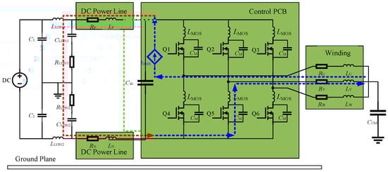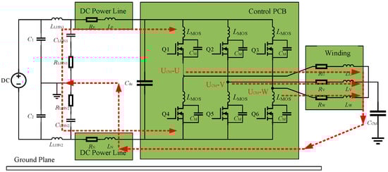 The common mode interference conduction path is shown as the red dashed line in Figure 8. Common mode interference is generated by transient voltage trips during switching dynamics, and the resulting current to ground forms a closed loop through the windings, ground, and DC line.