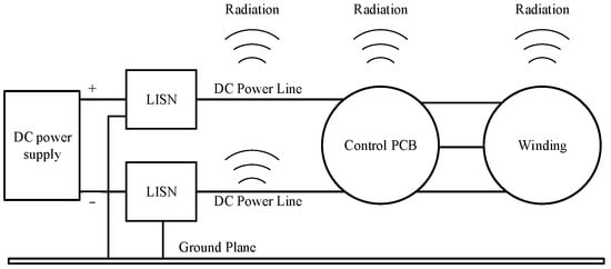 In the conducted path of electromagnetic interference, the DC power lines, windings, and PCB have antenna effects and can be highly efficient sources of electromagnetic radiation, and the interference current will radiate energy outward through these pathways, as shown in Figure 10. Therefore, before investigating the suppression methods of radiated interference, the intensity of radiated interference from the components in the loop needs to be further analyzed to target the proposed interference suppression methods.