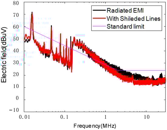 To analyze the electric field radiation intensity of the DC line, the UL1332 20# power lines without shielding layer were replaced by a double shielded line of RG316D, and the shielding layer was well grounded. The results of the radiated emission measurement are shown in Figure 11. There was no significant decrease in the amplitude of the peak field in the tested frequency band, which indicates that shielding the DC cables did not reduce the system radiated interference, i.e., for lower frequency bands, the DC power lines were not the main source of radiation for the axial flow fan.