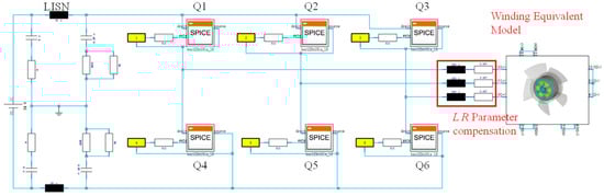 The axial flow fan has a winding structure with a three-phase star structure and six slots. To assess the radiated interference of the winding, this paper employed a hybrid modeling approach that integrated field and circuit elements. Specifically, during the winding modeling process, 3D modeling was conducted based on the actual winding layout. The R and L parameters of the winding were then compensated using a circuit model, as illustrated in Figure 12. As CST’s computational algorithms have difficulty in precisely modeling the influence of magnetic poles on winding parameters, we intentionally omitted the material properties of this component during the 3D modeling phase. Consequently, parameter compensation was applied in the circuit domain with R = 0.287 Ω and L = 250 μH according to reference []. This approach not only aligns with the actual 3D layout of the winding but also ensures that the circuit parameters of the winding meet the requirements.