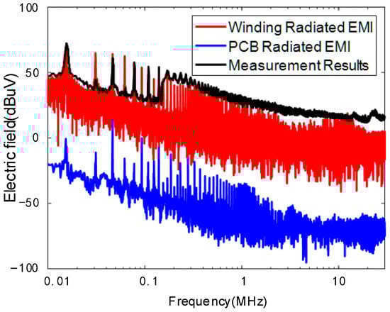 Comparison of the simulation results of the winding-radiated EMI and the PCB-radiated EMI with the measurement results.