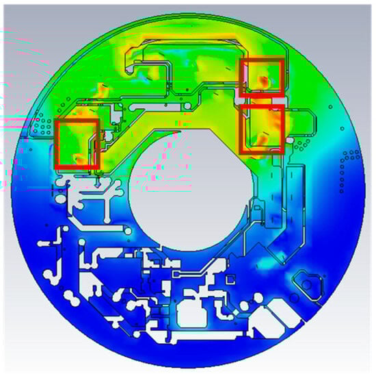 According to the simulation results, the peak frequency point of the radiated electric field was consistent with the experimental measurements. The radiated electric field intensity of the windings was much higher than that of the control PCB, which was close to the radiated electric field measurement results of the overall fan. The calculated surface current of the PCB at f = 15.5 kHz is shown in Figure 16. The position of maximum surface current is where the PCB was connected to the three-phase winding, i.e., the output side of the inverter circuit, marked by the red box in Figure 17. Therefore, it can be concluded that the windings were the main component that caused excessive radiated interference from the fan.