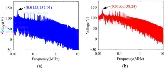 The voltage for the port of the windings was calculated via the field-circuit simulation model shown in Figure 13. Taking the U phase as an example, the simulation results are presented in Figure 19, compared with the spectrum of the voltage at the winding port obtained by FFT. The calculation results demonstrate a consistency between the simulation and measurement. Therefore, the circuit simulation model can effectively guide the design of EMI filters.