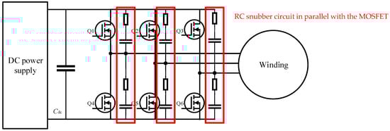 For the filter circuit topology design, if the low-pass filter includes an inductive component, the inductance value of the selected device will be at the mH level due to the lowest frequency of the interference peak of 15.5 kHz, resulting in a large filter size. As a miniaturized motor, axial flow fans have limited internal space, which makes it challenging to accommodate larger-sized components. Hence, this paper proposes a non-inductive RC snubber circuit connected in parallel between the drain and source of each MOSFET, absorbing the voltage peaks due to high-frequency switching. The circuit topology is shown, and the RC snubber circuit in parallel with the MOSFET is marked in red in Figure 20.