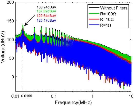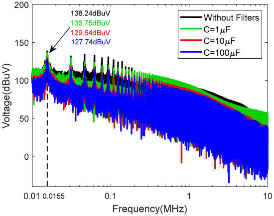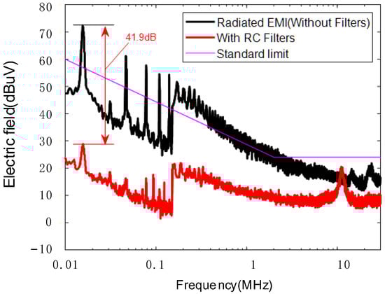 The comparative results before and after filtering for the fan radiated interference measurement are shown in Figure 24. The measurement results show that the designed RC filter had a significant absorption effect on the radiated interference in the frequency band. Radiated interference attenuation reached a maximum of 41.9 dB. Peak radiated interference in the frequency band was reduced below the standard limits. Meanwhile, during the experimental measurements, the speed of the fan was not affected by the access to the filter, which indicates that the designed filter can suppress radiated interference without affecting the effective signal insertion loss.
