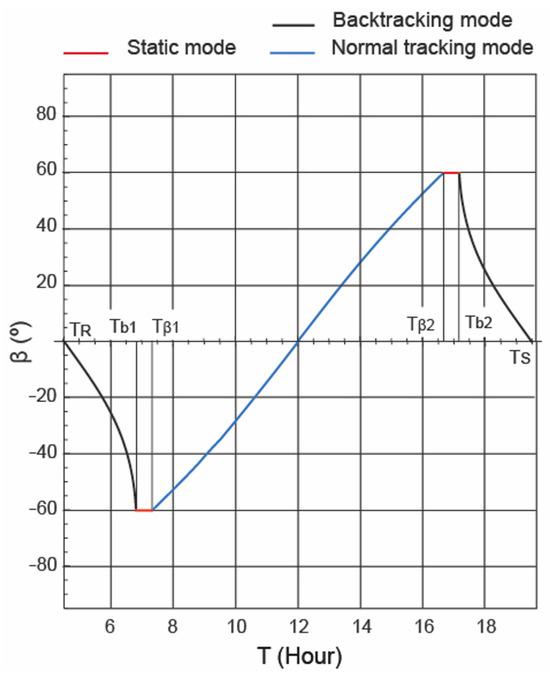 From sunrise to sunset, the field of a fixed tilt angle system always occupies the same position. In contrast, a horizontal single-axis tracker has three operation modes [23]: (i) backtracking mode, (ii) static mode, and (iii) normal tracking mode. Figure 1 shows these three operation modes.