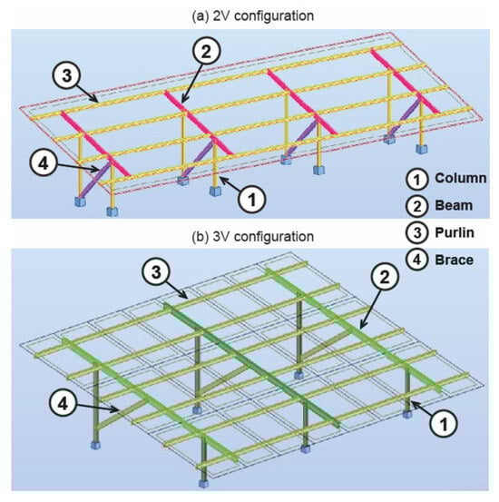 The structural system of a fixed tilt angle system is comprised of several elements: columns (1), beams (2), purlins (3), and braces (4) (see Figure 2). The column is embedded in the ground, using a suitable foundation, and it also serves as a seat for the beam. The beam supports the purlins, and the purlins are where the modules are fixed. Depending on the configuration used, a beam can be connected to one or two columns. Therefore, there are two types of configurations in relation to the number of columns [35]: (i) one-column mounted systems (see Figure 2a), and (ii) two-column mounted systems (see Figure 2b):