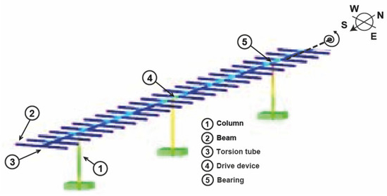 A horizontal single-axis tracker has its axis of rotation aligned with the north–south axis. Therefore, the field rotates from east to west, following the daily movement of the Sun. Furthermore, this east–west rotational movement has a limited tilt angle range (). This value is usually (°) [19]. The structural system of a horizontal single-axis tracker is comprised of several elements: columns (1), beams (2), torsion tube (3), drive device ( motor and drivers) (4), and spherical bearings (5) (see Figure 3):