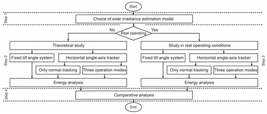 The proposed methodology consists of four main steps: (i) choice of solar irradiance estimation model, (ii) theoretical study, (iii) study under real operating conditions, and (iv) comparison of these studies. Figure 4 shows a flowchart summarising the proposed methodology. Please note that in steps (ii) and (iii) there are several possible studies related to the horizontal single-axis tracker. In a fixed tilt angle system, the field always occupies the same position from sunrise to sunset. In contrast, in a horizontal single-axis tracker under real operating conditions there are three modes of operation (backtracking mode, static mode, normal tracking mode). This mode of operation will be called Scenario 1; this is the real scenario, as it takes into account the movement limit () of the field and the backtracking mode. However, there are studies that consider that the solar tracker is in normal tracking mode from sunrise to sunset (Scenario 2), and that, therefore, the limit movement has an angle of (°) (this case is unrealistic).