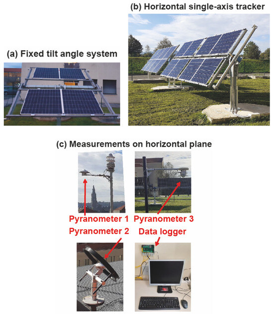 - A study under real operating conditions of the hourly incident solar irradiance on the field of a horizontal single-axis tracker and a fixed tilt angle system, considering various modes of operation of the solar tracker.