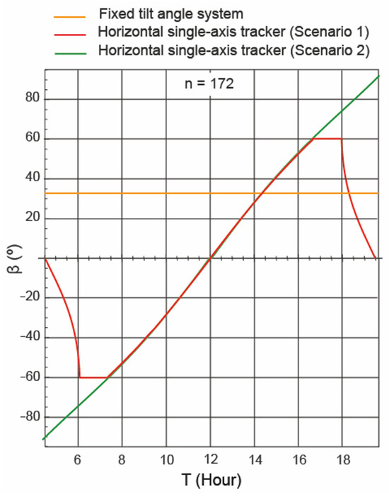 Due to wind loads, the tilt angle () of the field of a horizontal single-axis tracker cannot exceed a certain maximum tilt angle (). This maximum tilt angle is usually 60(°) [19]. Therefore, although the position of the Sun may suggest that the field has a tilt angle greater than the maximum tilt angle, the solar tracker will remain at . In other words, it will remain in static mode. The operating time of the solar tracker in static mode is (, ) and (, ) (see Figure 1). The choice of the angle has a great influence on the incident solar irradiance on the field [24]. And, as will be shown in the Results section, it also had a great influence on the conclusions of this study.