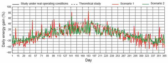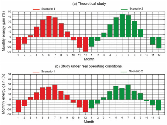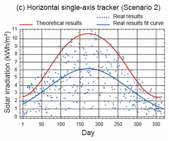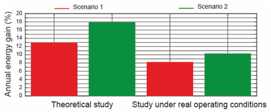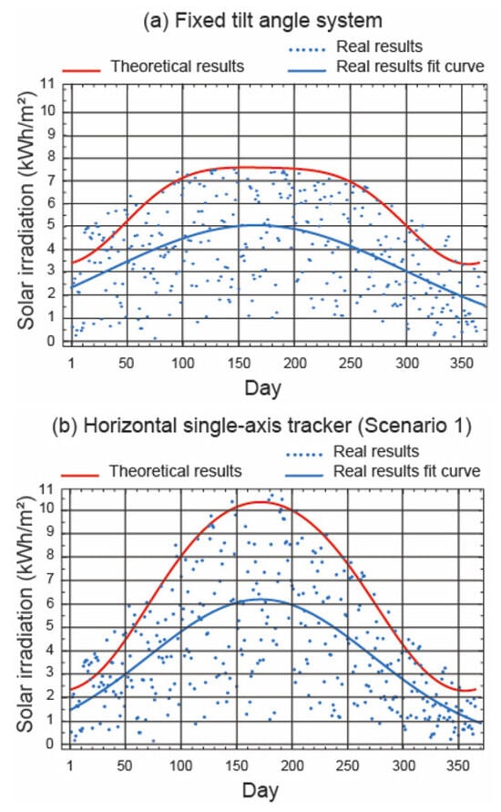 The aim of this paper was to delve deeper into the nuances of incident solar irradiance on the photovoltaic field of a fixed tilt angle system versus a horizontal single-axis tracker. The fixed tilt angle system was used as a baseline for comparison. Three assessment indicators were analysed (annual energy gain (), monthly energy gain (), daily energy gain ()). The procedure used comprised the following steps: (i) choice of solar irradiance estimation model; (ii) theoretical study; (iii) study under real operating conditions—for this purpose, an experimental setup was used; and (iv) comparison of these studies. The experimental setup was installed at the Department of Electrical Engineering of the University of Oviedo (Gijón, Spain) (latitude N, longitude W, elevation 28 (m) above sea level). Gijón is characterised by a temperate oceanic climate typical of Spain’s Atlantic coast, with cool summers and wet and mostly mild winters. The code assigned to Gijón under the Köppen climate classification is . The horizontal single-axis trackers that comprise photovoltaic power plants have three operating modes (Scenario 1). Some studies consider a unique mode of operation from sunrise to sunset (Scenario 2). The following conclusions can be drawn from the results obtained: (i) although the results obtained in the theoretical study and in the study under real operating conditions were different, a trend can be seen in the results; for example, the obtained was approximately and in the theoretical study and in the real study, respectively, in Scenario 1 and approximately and , respectively, in Scenario 2; Scenario 2 obtained higher results than Scenario 1 in all the assessment indicators; but it must be considered that Scenario 1 is the real mode of operation; (ii) from March to September, the horizontal single-axis tracker generates more electrical energy; as this period contains the months of greatest solar irradiance, the horizontal single-axis tracker performs better annually; considering the theoretical study and Scenario 1, the highest value of was in June () and the lowest was in December (); when the study was considered under real operating conditions, the highest result was in July () and the lowest was in December (); (iii) on the days between 70 and 277 in Scenario 1, the horizontal single-axis tracker generated more electrical energy; on the other days the opposite occurred; taking into account the theoretical study, the highest and lowest values were and , respectively; when the study was considered under real operating conditions, the highest and lowest values were and , respectively.